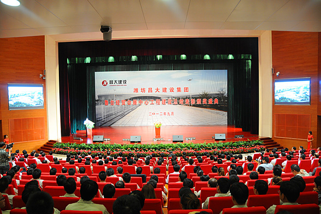 2012年9月29日,秋風(fēng)送爽,丹桂飄香。在這個(gè)金秋收獲的日子里,濰坊昌大建設集團會(huì )展中心工程建設總結表彰頒獎盛典在魯臺經(jīng)貿會(huì )展中心的會(huì )議中心報告廳隆重舉行。濰坊昌大建設集團全體高管層領(lǐng)導徐鵬強、朱九洲、滕忠斌、李坤明、姜建魯、穆乃杰、張連悅、張學(xué)智、閆鵬、劉雁冰,會(huì )展中心工程各參建單位全體參建人員、管理骨干,各分、子公司領(lǐng)導班子成員、管理骨干,集團總部全體人員,集團駐會(huì )展中心工程建設現場(chǎng)指揮部以及應邀參會(huì )的安順片區指揮部、工程設計、監理、咨詢(xún)等有關(guān)單位負責人共581人參加了頒獎盛典。應集團的邀請,濰坊市人民政府副市長(cháng)夏芳晨出席頒獎活動(dòng)并作重要講話(huà),市政府副秘書(shū)長(cháng)于為凱,市建設局局長(cháng)李廣東、副局長(cháng)張文等出席上述活動(dòng)。