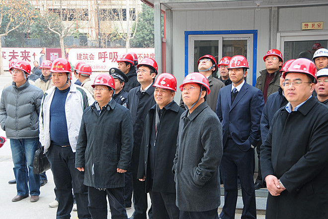 圖為徐鵬強董事長(cháng)與出席封頂儀式的嘉賓在現場(chǎng)