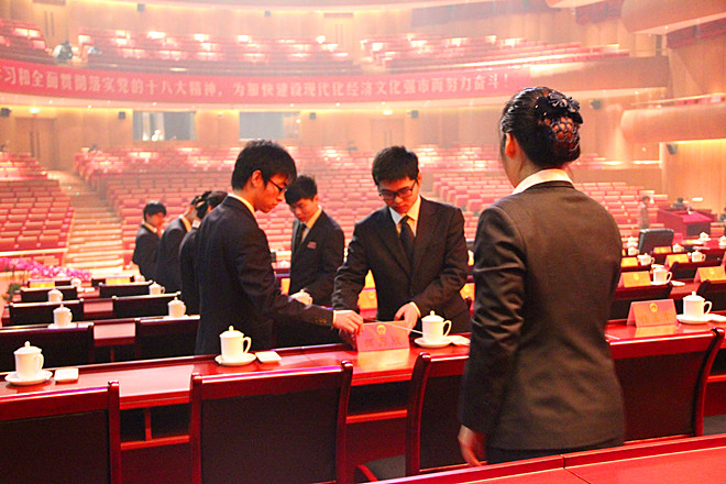 由于本次會(huì )議市政府要求不安排專(zhuān)業(yè)禮儀公司承接,這樣會(huì )務(wù)的服務(wù)接待任務(wù)也全部落在了公管公司。為做好會(huì )議接待服務(wù)工作,從2012年12月中旬開(kāi)始,公管公司挑選了35名人員并聘請專(zhuān)業(yè)講師進(jìn)行培訓。除此之外,公管公司執行董事李坤明親率公管公司領(lǐng)導班子成員和員工全面投入會(huì )務(wù)保障工作。會(huì )務(wù)期間,投入保潔75人,保安42人,接待35人,消防18人,電力保證12人,物資保障20人,制作安裝宣傳標語(yǔ)和引導牌200多塊,擺放花卉200多盆,鋪設地毯3341 平方米,調用桌子180張,椅子250把,沙發(fā)15套,各類(lèi)會(huì )議用品30多個(gè)品種。全面、高效、順利完成了對本次會(huì )議的保障工作。