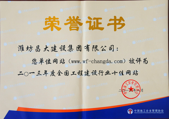 2013年8月15日至17日,中國施工企業(yè)管理協(xié)會(huì )召開(kāi)年度通聯(lián)員工作會(huì )議,報告通聯(lián)年度工作,開(kāi)展聯(lián)絡(luò )員通訊員交流活動(dòng),表彰優(yōu)秀報刊、網(wǎng)站,表彰優(yōu)秀聯(lián)絡(luò )員、通訊員。集團公司官方網(wǎng)站(www.wf-changda.com)被評為2013年度全國工程建設行業(yè)十佳網(wǎng)站?!恫蠼ㄔO報》被評為全國工程建設行業(yè)銀頁(yè)報紙獎。