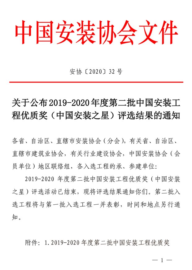2020年12月10日,中國安裝協(xié)會(huì )發(fā)布通知,通報2019-2020年度第二批中國安裝工程優(yōu)質(zhì)獎(中國安裝之星)項目,共222項,集團安裝公司承建的濰坊市第二人民醫院門(mén)診病房綜合樓一期(安裝工程)(第144位排序)榮獲該項榮譽(yù)。這也是集團建司以來(lái)首次參評并獲該項榮譽(yù)。據悉,該批次入選項目由272家會(huì )員企業(yè)擇優(yōu)推薦,初審243項工程,后經(jīng)專(zhuān)家審定了238項工程進(jìn)入今年10月的現場(chǎng)復查,11月,再由大評委無(wú)記名投票,產(chǎn)生最終的222項工程入選2019-2020年度第二批中國安裝工程優(yōu)質(zhì)獎(中國安裝之星)。中國安裝之星,是經(jīng)住建部批準設立的安裝行業(yè)最高質(zhì)量獎,也被稱(chēng)為安裝工程的“魯班獎”,由中國安裝協(xié)會(huì )組織實(shí)施,每年評選一次。 集團首次參評即獲得該項榮譽(yù),一是說(shuō)明集團對安裝專(zhuān)業(yè)的重視,二是說(shuō)明集團立足品牌戰略,安裝專(zhuān)業(yè)自我加壓開(kāi)始走向更高層次專(zhuān)業(yè)化平臺,為集團的后續發(fā)展提供了有力支撐。 ![]() |