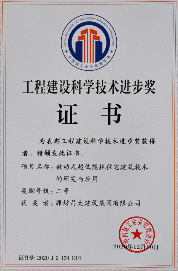 2020年12月11日,中國施工企業(yè)管理協(xié)會(huì )在北京召開(kāi)“2020年工程建設科學(xué)技術(shù)獎勵大會(huì )”,表彰了工程建設最高科學(xué)技術(shù)獎1項,工程建設技術(shù)發(fā)明獎10項,工程建設科學(xué)技術(shù)進(jìn)步獎343項。其中,集團二建公司工程公司《被動(dòng)式超低能耗建筑住宅技術(shù)的研究與應用》,經(jīng)過(guò)形式審查、專(zhuān)家網(wǎng)絡(luò )評審、專(zhuān)家委員會(huì )會(huì )議評審、科學(xué)技術(shù)委員會(huì )審定四個(gè)階段(本年度評審通過(guò)率只有40%),最終榮獲工程建設科學(xué)技術(shù)進(jìn)步獎二等獎。![]() |