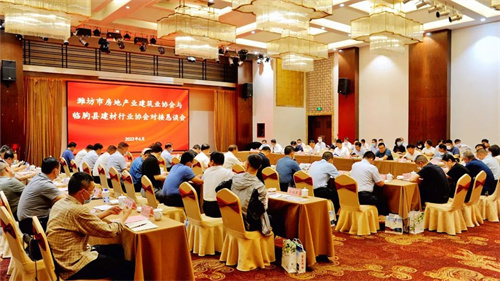 2022年6月11日,濰坊市房地產(chǎn)業(yè)協(xié)會(huì )、濰坊市建筑業(yè)協(xié)會(huì )與臨朐縣建材行業(yè)協(xié)會(huì )對接懇談會(huì )在臨朐縣攬翠湖酒店舉行。濰坊市建筑業(yè)發(fā)展服務(wù)中心副主任丁士剛,濰坊市房地產(chǎn)業(yè)協(xié)會(huì )會(huì )長(cháng)、集團董事長(cháng)徐鵬強,濰坊市建筑業(yè)協(xié)會(huì )會(huì )長(cháng)、集團總工程師房海,臨朐縣委副書(shū)記、縣長(cháng)陳誠,縣委常委、辦公室主任王磊,副縣長(cháng)董樹(shù)華,市房協(xié)副會(huì )長(cháng)單位和市建協(xié)副會(huì )長(cháng)單位20余位負責人,臨朐縣相關(guān)部門(mén)負責人出席對接懇談會(huì )。