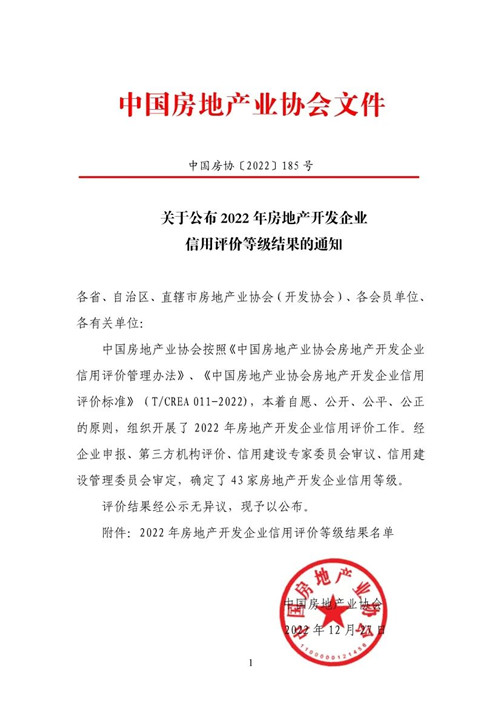 2022年12月27日,中國房地產(chǎn)業(yè)協(xié)會(huì )公布了2022年全國房地產(chǎn)開(kāi)發(fā)企業(yè)信用評價(jià)等級結果,全國43家房地產(chǎn)開(kāi)發(fā)企業(yè)經(jīng)嚴格、公正評審后獲評信用等級。集團泰和置業(yè)榮獲此次信用評價(jià)的最高等級——AAA級,這也是泰和置業(yè)繼2016年、2019年獲評AAA級后,再次獲得國家權威機構的肯定。作為衡量一家企業(yè)綜合實(shí)力的重要指標,企業(yè)AAA信用評級具有極高“含金量”。依據對評估對象的信用紀錄、履約能力、經(jīng)營(yíng)狀況以及專(zhuān)家實(shí)地核驗等多項指標的科學(xué)評估與認證,企業(yè)信用等級越高,代表其經(jīng)營(yíng)狀況、履約行為、信用紀錄越良好,是對企業(yè)信譽(yù)建設的高度認可。企業(yè)信用評級證書(shū)有效期3年,中房協(xié)委托評價(jià)機構對有效期內企業(yè)每年進(jìn)行信用動(dòng)態(tài)監測。 信用是企業(yè)寶貴的無(wú)形資產(chǎn),也是企業(yè)的誠信名片和市場(chǎng)通行證。泰和置業(yè)多次獲評最高信用等級,充分體現了泰和置業(yè)在誠信經(jīng)營(yíng)方面的重視與堅守,以“品質(zhì)”為基石,嚴格把控產(chǎn)品規劃設計、建設、銷(xiāo)售和服務(wù)的各個(gè)環(huán)節,精于勤,作于細,方寸之間,匠心盡顯。同時(shí)也說(shuō)明,集團各參建單位在統一協(xié)調配合等方面出色和卓越的工作。