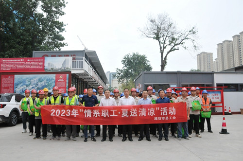 2023年7月12日上午,濰坊市總工會(huì )副主席朱建平到集團總承包施工的市重點(diǎn)項目濰坊市人民醫院項目現場(chǎng)進(jìn)行了“情系職工?夏送清涼”走訪(fǎng)慰問(wèn)活動(dòng),向廣大一線(xiàn)建設者表示慰問(wèn),并為一建公司、四建公司一線(xiàn)職工發(fā)放清涼物資包(天堂折疊傘、日照綠茶、六神花露水、奇強洗衣粉、舒蕾沐浴露、潔玉毛巾等)。