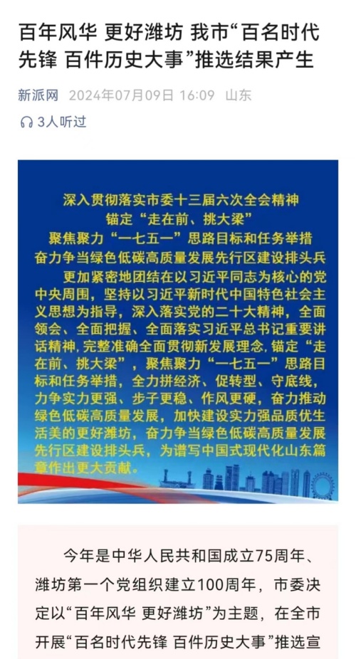 “百名時(shí)代先鋒、百件歷史大事”將進(jìn)一步推動(dòng)全市各級深入學(xué)習貫徹習近平總書(shū)記視察山東重要講話(huà)精神,按照市委十三屆六次全會(huì )的部署要求,錨定“走在前、挑大梁”,自信自強、開(kāi)拓創(chuàng )新、敢為爭先、勇毅前行,在新征程新起點(diǎn)上全面提升各項工作檔次水平,奮力推動(dòng)綠色低碳高質(zhì)量發(fā)展,加快建設實(shí)力強品質(zhì)優(yōu)生活美的更好濰坊,為譜寫(xiě)中國式現代化山東篇章作出更大貢獻。